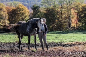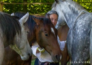 Les poulains naissent dans nos bras, généralement en box à La Goudelie. Ce contact immédiat à la naissance est un facteur important dans la confiance qu’ils nous accordent plus tard. Ils sont, dès les premières semaines, éduqués à donner leurs pieds et à accepter le licol. Sortis et rentrés avec leur mère, tous les jours à l’écurie les deux premiers mois, ils s’habituent progressivement, et peuvent être menés en longe assez rapidement. Comprenant ce qu’on leur demande, ils n’en sont que plus confiants. Ils grandissent au pré (avec abris), avec leur mère et leurs aînés. Ils rentreront au box les soirs froids de l’hivers, ou pour des soins. Le sevrage n’est effectué que tardivement, vers 8 ou 9 mois, profitant ainsi plus longtemps du réconfort maternel. Au sevrage ils sont à nouveau rentrés au box tous les soirs pendant un mois ou plus, pour parfaire leur éducation, puis vivent au pré avec leurs ainées. Le débourrage n’intervient que dans leur troisième ou quatrième année, afin de préserver leurs articulations. Nous effectuons un débourrage progressif dont la rapidité est variable en fonction de chaque cheval. Généralement le Lusitanien est un cheval tardif dont la morphologie n’est pleinement formé que vers 8 ans. La présentation ici s’effectue dans l’ordre des naissances.